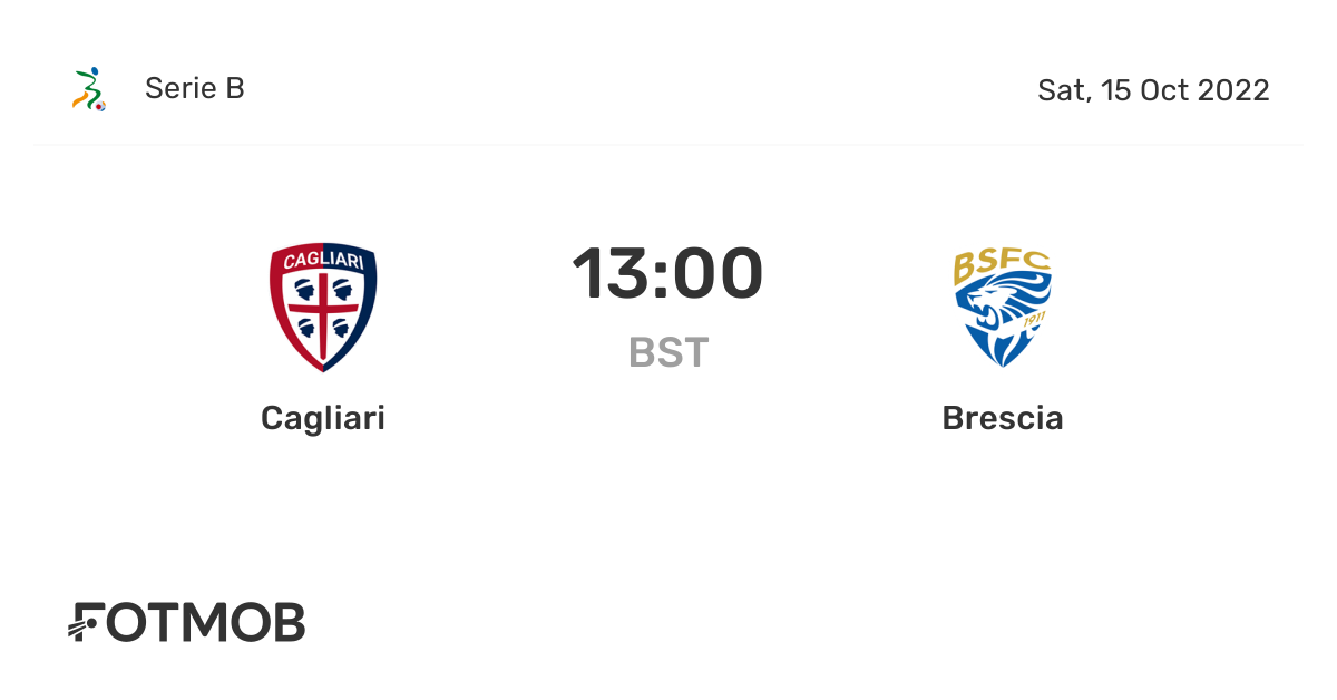 Cagliari-Brescia la FOTOGALLERY. Saturday 15 Oct 2022 0500 AmericaLos_Angeles Best Odds. 9 hours agoIl Cagliari chiude il primo tempo in vantaggio per 2-0 sul Brescia grazie ai gol di Luvumbo al 10 e Deiola al 33.